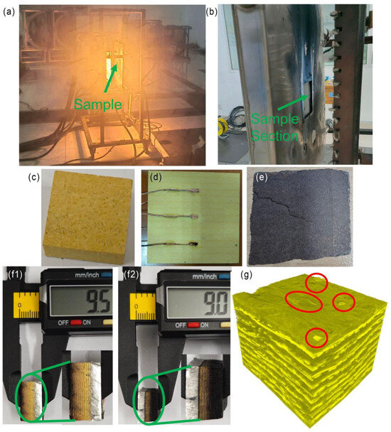 Figure 2(f1,f2) shows the sides of PR/NQF0.8 after 250 s of ablation at 600 °C and 1000 °C, respectively. The thickness of virgin samples was 10 mm, and, after ablation, the thickness decreased to 9.5 mm and 9.0 mm, respectively. In the thickness direction, a clear gradient transition from the ablation layer to original material was evident. Meanwhile, the ablation layer thickness was significantly increased as the ablation temperature rose. Throughout the heating process, the samples demonstrated excellent non-flammability and dimensional stability, with no noticeable shape changes.
