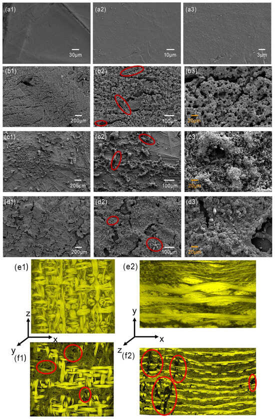 Figure 2e,f. Some cracks, pits and exposed fibers can be observed on the surface.