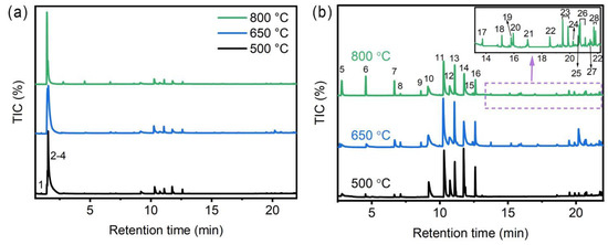 61]. The 300–850 °C stage represented the primary weight loss process. According to results of Py-GC-MS (