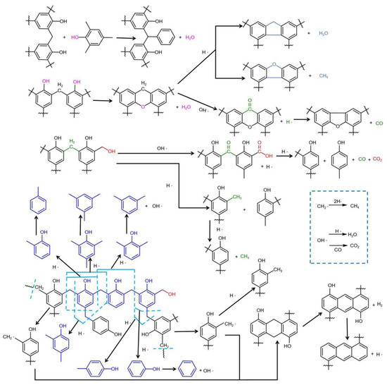 60]. The weight loss during 150–300 °C was associated with the thermal volatilization of free phenol in resin and the polycondensation reactions of hydroxyl and hydroxymethyl groups [