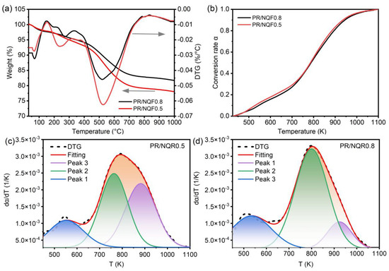 Due to the fact that mass loss below 150 °C is primarily attributed to the release of adsorbed water in composites, the starting point of the thermal decomposition reaction conversion rate was defined as 150 °C; the results of the conversion rate are shown in
