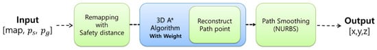 The algorithm begins by generating a safety zone based on the given grid map, considering the UAV’s radius as shown in Figure 2. This ensures that the planned path does not come too close to obstacles. Using the map data, including the safety zones, the modified A* algorithm is executed to find a feasible path. The resulting path is then simplified using a path reduction algorithm, followed by a smoothing process to create a trajectory that the UAV can dynamically follow. Detailed designs of each module are described in the following sections.