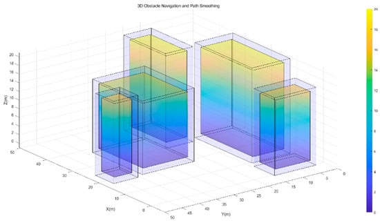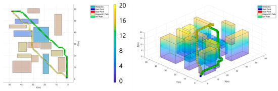 The overall structure of the proposed algorithm is shown in Figure 1. The algorithm takes the map information, a starting point, and a user-defined destination point as inputs. MATLAB/Simulink 2024a was used as the development platform, and the study was conducted under the assumption that map information is provided in the form of an occupancy grid map. The grid environment is a 60 × 50 × 20 m 3D map with a grid size of 1 m. Obstacles were modeled as rectangular prisms, representing urban buildings, and were randomly placed in positions that do not overlap with the start or destination points. The dimensions of the obstacles were set to be at least 5 m in the x and y directions and 12 m in the z direction.