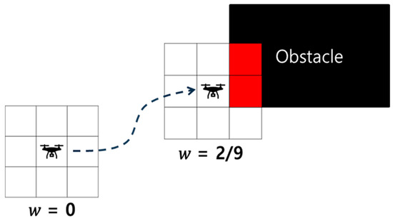 In DA*, the heuristic function incorporates local obstacle density to enable effective path planning in complex environments. The obstacle density, , is defined as a value between 0 and 1. As shown in Figure 3, indicates no obstacles in the vicinity, while approaching 1 signifies the surroundings are almost entirely obstructed. The density is computed for each node by dividing the number of cells occupied by obstacles within a 3 × 3 × 3 neighborhood by the total number of cells (26 in three-dimensional space).