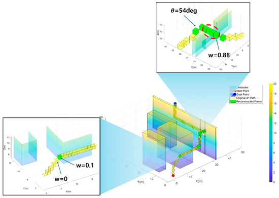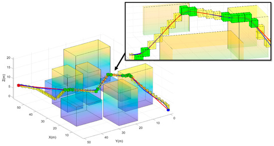 The results of applying the path simplification algorithm are shown in Figure 5. Unlike the previous figure, the yellow cubes represent the initial path coordinates generated by the DA* algorithm, while the green cubes indicate the nodes after applying the simplification logic. The figure highlights the critical nodes selected based on changes in obstacle density, as well as those identified using thresholds for path angles and obstacle density. This approach ensures that the simplified path retains critical waypoints necessary for obstacle avoidance and efficient trajectory generation while reducing unnecessary complexity in less critical regions.