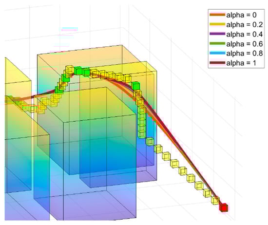However, the comparison of paths based on different values is shown in Figure 7. When is small, the interpolation weights decrease, resulting in minimized curvature and smoother paths. As increases, the curvature becomes larger, enabling quicker direction changes and sharper maneuvers. This demonstrates that if a path overlaps with obstacles, can be increased to re-interpolate the path, allowing for effective path verification and adjustment l.