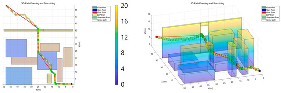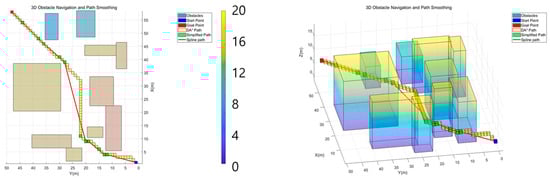 The parameters used in the algorithm are summarized in Table 1. The initial path generated by the DA* algorithm effectively integrated obstacle density and altitude costs, avoiding areas with high obstacle density and minimizing unnecessary altitude changes. After applying the path simplification and smoothing processes, the final trajectory was optimized for UAV navigation. The simplified path retained critical waypoints while eliminating redundant nodes, and the smoothed trajectory ensured continuous curvature and dynamic feasibility, meeting the operational requirements of UAVs in complex 3D environments. Figure 8, Figure 9 and Figure 10 illustrate the results of algorithm execution across various environments.