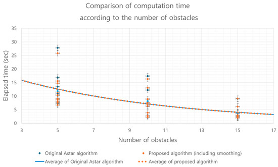 Figure 11 compares the computational speed of the proposed algorithm with that of the conventional A* algorithm under varying obstacle densities. The results show that the proposed algorithm achieves computational costs comparable to the conventional A* algorithm, even with the addition of the path interpolation process. When evaluated in identical map environments and using the same algorithm parameters, the proposed algorithm demonstrated nearly identical computational speeds. Both algorithms also displayed a consistent trend of reduced search time as the number of obstacles increased. This trend can be attributed to the confined map size, where higher obstacle densities limit the number of feasible paths, thereby shortening the search process.