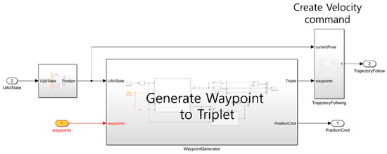 In this equation, represents the weight for the current waypoint and is defined as the ratio of the distance to the threshold distance which determines waypoint proximity. presents the weight for the next waypoint and is calculated such that it gradually increases as the UAV approaches the current waypoint. Figure 12 shows the trajectory following module implemented in Simulink.