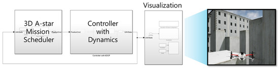 In the Simulink simulation, the system is organized into three main modules, as shown in Figure 13. The first module runs the designed A* algorithm and path interpolation. It schedules path planning based on the UAV’s current state feedback to generate position commands. The second module is the dynamics module, which includes controllers. It consists of a dual PID control loop for position/velocity control and uses an approximate dynamics model, including the attitude controller, to compute the UAV’s current position and orientation. Finally, the visualization module integrates with Unreal Engine to display obstacle and UAV position information based on the current state of the UAV.