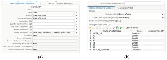Simulation software operational parameter settings: (a) runway separation interval parameters; (b) parking position usage rule parameters.