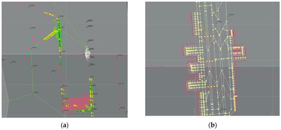 The simulation software used in this evaluation experiment is AirTOP (https://www.transoftsolutions.com/zh-hans/aviation/software/airport-airspace-fast-time-simulation/airtop-overview/, accessed on 19 January 2025). This software, developed by the Canadian Company TransSoft (Vancouver, BC, Canada), is a fast-time simulation tool based on time, events, rules, objects, and participants. Based on data from a specific airport’s terminal area, a simulation operation evaluation database was established. Operational parameters and flight schedule plans were input into the AirTOP simulation model, as shown in Figure 1. Figure 2, Figure 3, Figure 4 and Figure 5 illustrate the simulation schematics of the terminal area airspace and airport surfaces for Shanghai Hongqiao International Airport, Nanjing Lukou International Airport, Shenyang Taoxian International Airport, and Urumqi Diwopu International Airport.
