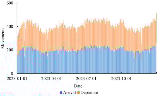 According to the Airport Slot Capacity Evaluation Technical Specifications (AP-93-TM-2017-01) issued by the Civil Aviation Administration of China, the selection criterion for a typical day is based on the day corresponding to 90% to 95% of the maximum single-day traffic volume from historical data. When selecting a typical day, actual operational data from a longer time frame (e.g., a full year) are used, and the 90–95% selection principle is applied to ensure that the typical day represents the normal operational conditions of the airport across various operational environments. For a particular airport, the actual operational data from 26 March 2023 to 26 March 2024 are shown in Figure 6. Using the 95–98% selection principle, 15 February 2024 was chosen as the typical day, with the actual number of flights on that day being 500 operations.