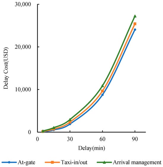 Delays are often related to airport capacity overload, and delay costs reflect the economic losses caused by flight delays to airlines. For airlines, the costs of aircraft at different flight phases are calculated in different ways. Here, ( = 1, 2, 3, 4) represents the following phases: at-gate, taxi-out, taxi-in, and arrival management. The delay cost for each flight phase can be expressed as a function , which denotes the cost of the phase caused by the delay duration at phase . The total delay cost for a single flight, denoted as , is calculated as