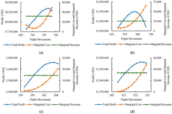 Marginal analysis of capacity thresholds for four airports: (a) Shanghai Hongqiao International Airport; (b) Nanjing Lukou International Airport; (c) Shenyang Taoxian International Airport; (d) Urumqi Diwopu International Airport.