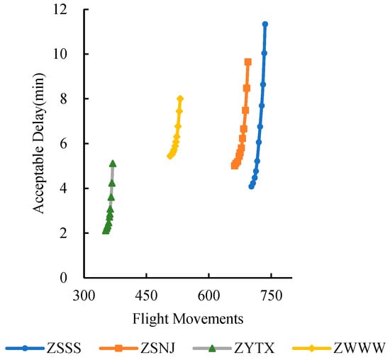 The existing airport capacity evaluation system applies a uniform simulation of acceptable delay levels across airports with different characteristics and needs, overlooking the differences in operational environment, geographical features, traffic demand, and facility scale among airports. The FAA emphasizes that a single acceptable delay level is not suitable for all airports and points out that different stakeholders have varying sensitivities to delay characteristics, suggesting the establishment of differentiated airport capacity delay threshold indicators [5]. Similarly, Eurocontrol has acknowledged the limitations of using a uniform capacity threshold, noting the differences in how various stakeholders and modeling tools measure and report delays [6]. The Civil Aviation Administration of China has also stated that airports can determine their own acceptable delay levels based on specific conditions [7]. Therefore, scientifically evaluating airports’ declared capacity and establishing differentiated simulation acceptable delay levels for airports with different characteristics is beneficial for providing more reasonable declared capacity for airport demand–capacity management [8].