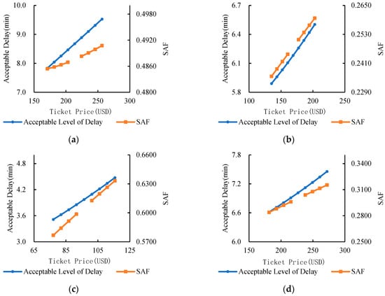 It can be observed that the relationship curves between ticket prices and delay thresholds for all four airports follow the same trend: acceptable delay levels increase as ticket prices rise, showing a positive correlation. This is because ticket prices directly affect revenue levels, which in turn influence the intersection point of marginal revenue and marginal cost. As ticket prices increase, the intersection point shifts to the right, resulting in a higher acceptable delay level. This also explains the lower threshold observed for Shenyang Taoxian International Airport, where lower ticket prices led to a leftward shift of the intersection point, reducing the acceptable delay level.