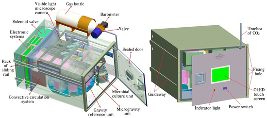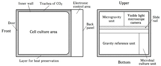 The overall layout of the culture device is shown in Figure 1. The cell sample culture device consists of a box, an airtight door, a temperature control system, a control system of CO2 gas concentration, a microgravity unit, a gravity reference unit, a visible light microscope camera, an OLED touch screen, and other components.