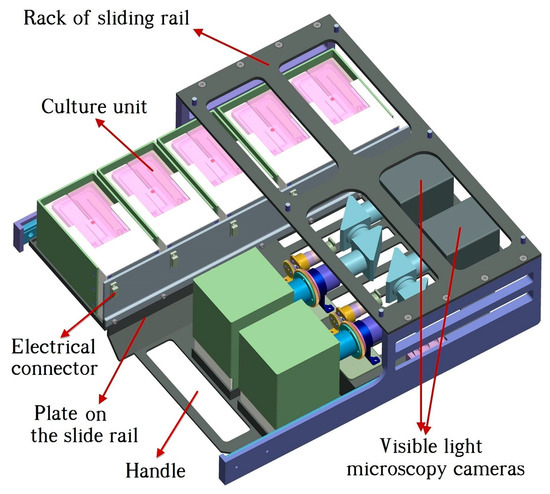 The microgravity unit is shown in Figure 3. A row of five sample culture units are fixedly installed on the mounting plate and a certain reasonable gap is ensured between each culture unit. In addition, two sample culture units are placed in front of two visible light microscopy cameras. When replacing the sample culture units, the microgravity unit needs to be pulled out as a whole through the guide rails. After replacing the sample culture units, it should be pushed into the cell sample culture device as a whole. The front end of the sample units before the visible light microscope cameras is designed with a hollow handle, which helps astronauts to pull out the microgravity unit and visible light cameras as a whole [16].