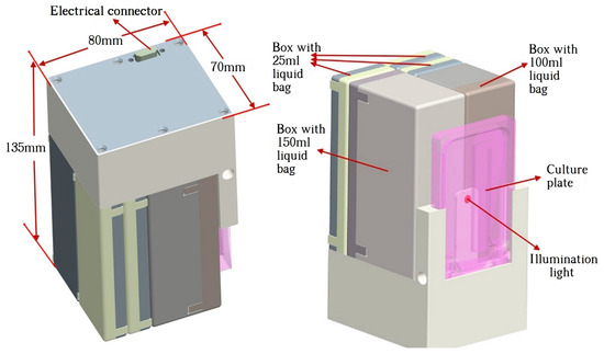 The composition of the sample culture unit is shown in Figure 4, which includes a culture plate, an illumination light, a box with a 150 mL waste liquid bag, a box with a 100 mL liquid bag, and three boxes each with a 25 mL liquid bag. The external dimensions of the sample culture unit are 135 mm × 80 mm × 70 mm. The sample culture units are mainly used to culture human cells and the culture medium is filled in the internal cavity of the culture plate. The means of culture is liquid perfusion culture, and the cells grow suspended in the culture medium. The culture medium contains dissolved oxygen and nutrients needed for growth. The duration of the cell-culture experiments is five days to 10 days normally.