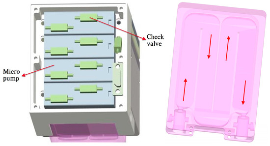 The driving principle of liquid in the sample culture unit is shown in Figure 5. Four micro pumps are placed side by side at the bottom of the sample culture unit, with a gap of 0.3 mm between adjacent micro pumps. There is a 7 mm gap between the micro pumps and the lower cover plate for placing the liquid pipe and the check valve on the liquid pipe. There are four micro pumps in a sample culture unit, and the micro pumps are integrated with DC motors inside. The motors rotate the micro pumps and drive the flow of liquid in the tubes. Each micro pump needs to be equipped with two check valves, and one check valve is also required on the liquid pipe of the waste liquid bag. Therefore, each sample culture unit needs nine check valves. The arrows in the right figure show the directions of liquid flow.