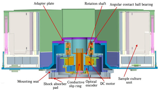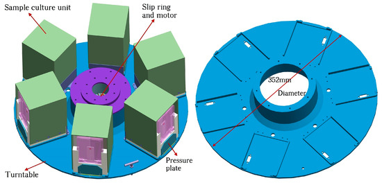 The gravity reference unit mainly consists of six sample culture units, a turntable, a mounting seat, a conductive slip ring, a DC motor, an optical encoder, bearings, and other parts. Six sample culture units are evenly distributed on a circular turntable, and the turntable is driven to rotate by a torque motor to simulate the gravity environment in space [18].