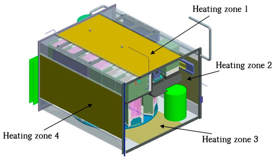 The main measure of the active thermal control design is to stick heaters on the inner shell of the culture device to ensure a sufficiently high temperature inside. Four heating zones are evenly arranged around the outer side of the inner shell of the culture device, with a total power of 80 W and a heating power of 20 W for each. Heating zones 1 and 3 are equipped with heaters with a size of 240 mm × 480 mm, while heating zones 2 and 4 are equipped with heaters with a size of 200 mm × 480 mm. The distribution of heating zones is shown in Figure 11.