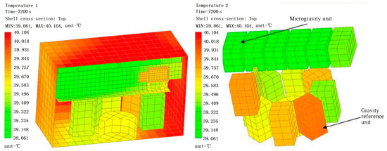 After completing the establishment of the thermal control model for the sample culture device, the layout of the electric heater, and the distribution of heating power, the thermal analysis software was used for the thermal analysis calculation. The advanced thermal analysis and computation scheme of the thermal analysis software can achieve good simulation calculation of heat transfer. In order to verify that the temperature control method of the heating can control the temperature inside the cell-culture device between 30 °C and 40 °C, the thermal analysis mainly concerns the temperature distribution under extreme high temperature conditions of 40 °C. In actual cell culture, the temperature in the cell-culture area can be maintained at a suitable temperature (it is 37 °C normally) by controlling the switch of the heating device.