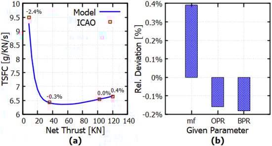 Engine model verification: (a) comparison of model-estimated operating line and ICAO-given operating points along with relative variation of the line with respect to each point, (b) design point model-estimated parameter variation with respect to ICAO-given values.