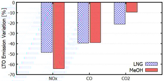Regarding the EIs covered in Table 2, both fuels severely reduce emissions for the same thrust setting. Examining only the EIs indicates that MeOH shows a clear advantage over LNG when it comes to curbing of pollutant emissions. Yet when analyzed as part of the engine LTO cycle for each fuel, the results differ, because the variation of and the time of each phase play a significant factor as well, according to Equation (2). The increase in fuel consumption of MeOH, presented in Table 2, plays a significant factor in the LTO emitted mass of pollutants shown in Figure 11. Specifically, the reduction potential of LNG is about 21%, while MeOH’s potential amounts to 10%, always relative to the GTF/JetA results of the model, presented in Figure 8. In contrast, MeOH clearly displays the capability to reduce LTO by 64%, thus overcoming the LNG’s potential of 48%, proving that when it comes to the EI reduction prevails over the increase in fuel flow. The emitted mass of LTO remains practically the same for both fuels.