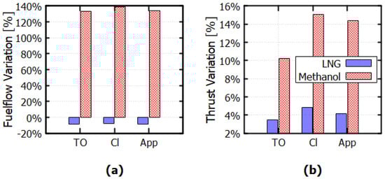 Subsequently, the LNG and MeOH are evaluated and compared in the same manner, but this time under the assumption that the same TIT as the baseline Jet-A operation is maintained. This analysis, referred as set-TIT approach, serves to enhance our understanding of the expansion of current technological capabilities of aero-engines when fueled by LNG or MeOH. It assumes that retrofitting requirements for such fuels affects the propulsive needs of the existing fleet [,]. Thus, this analysis opts to provide insights into the adaptability of current engine technology to alternative fuels.