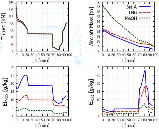 The set- condition denotes the possibility of operating current engines using LNG or MeOH with minimized changes in the engine cycle and aircraft infrastructure, assuming alterations be limited to the aircraft’s fuel storage and supply systems. Thereby, the set- approach constitutes a more conservative alternative fuel evaluation scenario. The main thermodynamic and emission parameters yielded from this analysis are shown in Table 2.