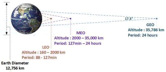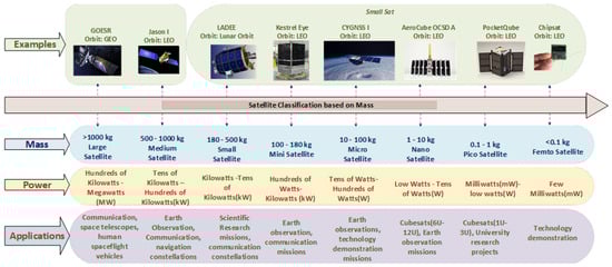 Satellites have been extensively used for applications such as mobile communication, radio and television broadcasting, military intelligence, weather forecasting, and navigation. The launch of the satellites Sputnik (83 kg) and Explorer 1 (14 kg) by Russia and America, respectively, marked the beginning of the age of satellites [1,2,3]. Satellites are classified based on their mass into large, medium, and small satellites [1,2]. Large and medium satellites ( kg) can carry more payload and integrate larger solar arrays to produce more power, making them suitable for communication, remote sensing, and applications with a lifetime above 10 years. Small satellites ( kg) are small and cheap, with shorter mission times than large satellites [1,4,5]. Hence, they are suitable for applications such as Earth observation, disaster management, space science, microgravity research, earthquake forecasting, and gravitational field measurements, to name a few [1,6]. For many applications, two or more small satellites work together to form constellations or operate in formation flying [1,7,8,9]. The classification of satellites based on their mass, their corresponding power ranges, and applications is demonstrated in Figure 1 [10,11,12,13,14,15,16]. The mission’s orbit is another parameter to be considered for satellites that are classified based on their relative distance from the Earth as Low Earth Orbit (LEO), Geosynchronous Earth Orbit (GEO), Medium Earth Orbit (MEO), and deep space missions. While LEO satellites are used for remote sensing, GEO satellites are mainly used for communication and broadcasting. MEO satellites are used for navigation, communication, and geodetic/space environment science [10,17]. The various mission orbits and their relative distances from the Earth’s surface are shown in Figure 2.