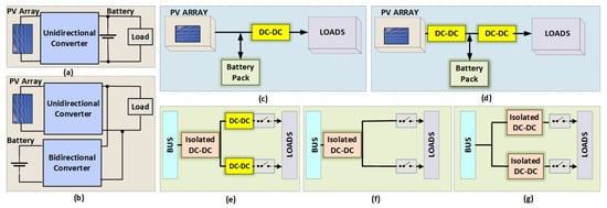 Satellite EPSs can be classified into unregulated bus and regulated bus systems. Figure 5a,b show the two types of bus systems [37]. To reduce the number of components, conversion stages, and cost, and to improve the reliability of the regulated bus system, unidirectional and bidirectional converters are sometimes integrated into a single unit, resulting in a three-port integrated converter. A comparison of a conventional two-port converter and an integrated three-port converter for satellite EPSs was discussed in [38]. The power transfer from the source to the batteries and loads uses either the Direct Energy Transfer (DET) or Maximum Power-Point Tracking (MPPT) architectures [23,36,39,40,41,42,43,44,45,46]. Figure 5c,d show these architectures, respectively [47,48]. While the MPPT architecture is used in low- and medium-power LEO satellites and interplanetary missions using unregulated bus systems, the DET is widely used in medium- and high-power GEO satellites using fully regulated bus architectures [49]. Two basic design approaches are used for distributing power: distributed power and decentralized power architectures [50]. Figure 5e shows a schematic of the distributed power architecture, and two types of decentralized approaches are demonstrated in Figure 5f,g [50].