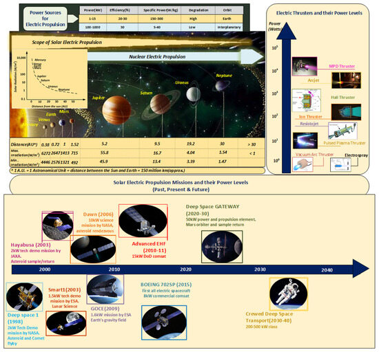 EP systems for satellite applications convert electrical potential energy to kinetic energy to accelerate a propellant. The transition can generally be done electrostatically, electrothermally, or electromagnetically based on the method used to accelerate the propellant [25,58,59,60]. In contrast to chemical propulsion, EP relies on energy sources such as solar arrays, batteries, a Radioisotope Thermoelectric Generator (RTG), or a nuclear reactor and accounts for only about 10–50% of the overall mass of a satellite [61,62]. The most popular and mature technology is solar EP. However, the scope of solar EP is limited by the available solar radiation in space, which decreases quadratically with the distance from the sun [63]. Nuclear EP uses energy from a fission reaction to ionize the propellant to generate the required thrust. It can provide higher power than solar EP and is especially beneficial for missions further from the sun, where the ability to harness solar power becomes impractical [64]. Nevertheless, several barriers need to be crossed before its actual implementation. A schematic showing various aspects of electric propulsion, such as the types of electrical thrusters along with their power levels, the scope of solar EP and nuclear EP, and a few past, present, and future solar EP missions along with their power levels, is shown in Figure 6 [65].
