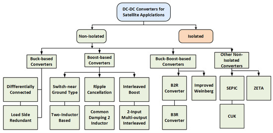 This section reviews the various non-isolated DC-DC converters for satellite applications. The classification is shown in Figure 8. Non-isolated converters provide benefits such as design simplicity, reliability, and a reduced component count [69]. Nevertheless, they suffer from problems such as a lack of controllability and increased losses due to extreme duty-cycle operation [70]. They find applications in small satellites for converting and regulating power.