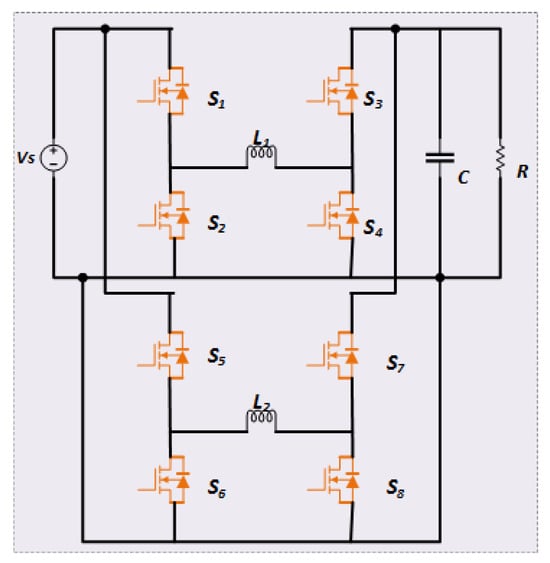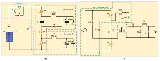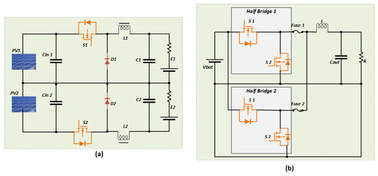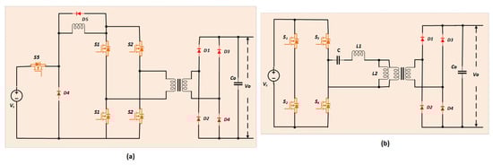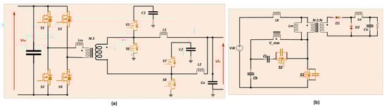 A current-fed converter based on the cascaded buck and full-bridge topology was investigated in [96]. The converter is shoot-through tolerant and has a wide output voltage range. However, its high component count, limitation in operating frequency, and lower efficiency due to additional switching stages are the disadvantages of this topology. Figure 14a shows the circuit topology of a current-fed cascaded buck and full-bridge converter.