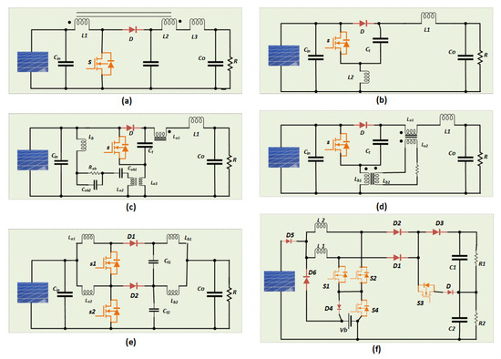 Boost-derived topologies: (a) boost converter with a near switch ground, (b) 2-inductor boost converter, (c) ripple cancellation-based boost converter, (d) common damping 2-inductor boost converter, (e) interleaved boost converter, (f) 2-input multiple-output interleaved boost converter.