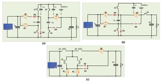 Buck–boost-derived topologies: (a) B2R converter, (b) B3R converter, (c) improved Weinberg topology.