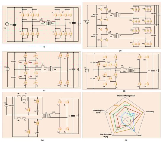 Ref. [103] performed the modeling, design, implementation, and performance evaluation of the DAB converter using SiC switches for aircraft electrical power networks. Ref. [104] compared the conventional DAB, Active Neutral Point Clamped (ANPC), Neutral Point Clamped (NPC), and Input-Series Output-Parallel (ISOP) converters using Wide-Band-Gap (WBG) devices for more electrical aircraft (MEA) applications. Figure 15a–e show these DAB topologies. A comparison in terms of efficiency, heat management, power density, specific power, and EMC is shown in Figure 15f [104]. The figure illustrates the superiority of the ANPC type concerning efficiency, heat regulation, and power density. The ISOP and conventional DAB converters exhibit comparable results, with the conventional DAB showing higher efficiency. Although the NPC converter provides the best EMC performance along with the ANPC type, it shows poor performance in terms of the other three parameters. The design of a conventional DAB converter for space applications was discussed in [105].