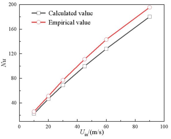 In the formula, ρ, μ, and λ represent the density, velocity, and dynamic viscosity; diameter of the streamline heat pipe; and thermal conductivity coefficients, respectively. To validate the numerical method used in this study, the numerical results of the Nusselt number were compared with the empirical formulas in the pin fins [17]. As shown in Figure 4, the error of Nu between the numerical simulation in this study and the empirical formula is within 8.5%, and the maximum error takes place at uin = 90 m/s. Overall, the numerical simulation method in this study can accurately reveal the physical mechanisms of heat transfer and flow in the streamline heat pipe heat exchanger.