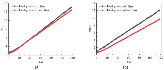 In summary, the installation of fins in the condensation section effectively enhanced the overall heat transfer capacity of the streamline heat pipe heat exchanger. The temperature drop with fins is up to 685 K, which is 20 K lower than the case without fins. A lower temperature is reached in the heat pipe with fins, which shows better heat transfer performance. It is noted that installing the fins in the condensation section also had a big impact on the flow and convective heat transfer in the evaporation section. Compared to the case without fins, fins resulted in 6.4% and 25.4% increases in the pressure loss coefficient in the evaporation and condensation sections.