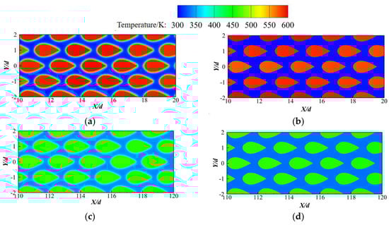 Temperature contours at the central cross-section of condensation section: (a) with fins near 10 < X/d < 20; (b) without fins near 10 < X/d < 20; (c) with fins near 110 < X/d < 120; (d) without fins near 110 < X/d < 120.