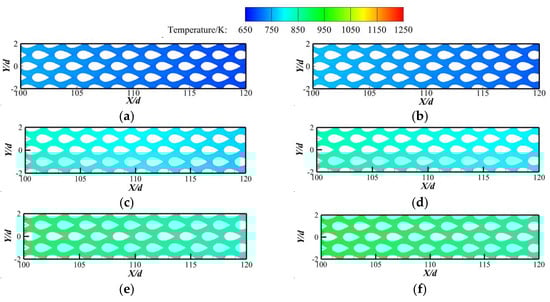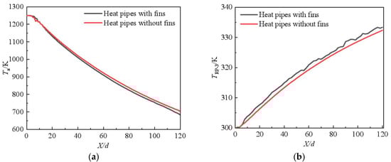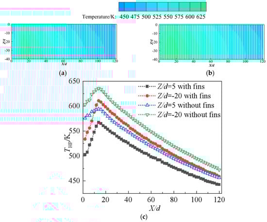 Figure 7 shows the temperature contours at the central cross-section of the condensation section. Figure 8 shows the temperature variation at the central cross-section along the flow direction. Figure 9 shows the distribution of temperature at the central cross-section of the condensation section. As shown in Figure 7, the installation of fins not only enhanced the convective heat transfer between kerosene and the heat pipe pin fins but also reduced the temperature rise in the heat pipes. The convective heat transfer on the condensation side intensified, which improved the performance of the heat pipe heat exchanger. For instance, the temperature of intake air in the outlet, with fins, is 685 K, which is 20 K less than the case without fins. The temperature of kerosene gradually increases along the flow direction. Due to the high specific heat of kerosene, the temperature rise in the kerosene with fins is less than 2 K. As shown in Figure 8 and Figure 9, the installation of fins in the condensation section has a significant role in affecting the temperature distribution of the heat pipe. The temperature of the heat pipes first increases and gradually decreases after reaching the peak value, which is located near the region of X/d = 17. The inner temperature along the heat pipe with fins is lower than that without fins. Near the front row of the heat pipe, the temperature with fins is much lower than the case without fins. The maximum difference in temperature between the two cases is up to 73 K. This is attributed to the fact that the convective heat transfer between kerosene and the heat pipe is enhanced, which reduces the temperature on the condensation side of the heat pipe. The difference in temperature between two cases gradually decreases along the flow direction. Also, the difference in the peak temperature of the heat pipes between the two cases is less than 25 K.