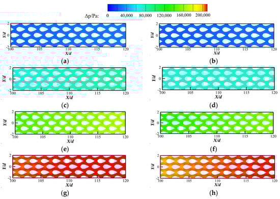 Pressure contours at the central cross-section of evaporation section at different mass flow rates of kerosene. (a) qRP-3 = 0.1 kg/s, with fins. (b) qRP-3 = 0.1 kg/s, without fins. (c) qRP-3 = 0.2 kg/s, with fins. (d) qRP-3 = 0.2 kg/s, without fins. (e) qRP-3 = 0.3 kg/s, with fins. (f) qRP-3 = 0.3 kg/s, without fins. (g) qRP-3 = 0.4 kg/s, with fins. (h) qRP-3 = 0.4 kg/s, without fins.