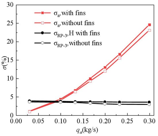 To explore the mass flow rate of the intake air (qa) in the convective heat transfer and flow of the streamline heat pipe heat exchanger, the qa varies from 0.03 kg/s to 0.3 kg/s, while the other parameters are the same as the baseline. Figure 10 shows pressure contours at the central cross-section of the evaporation section. Figure 11 shows the variation in the pressure loss coefficient with the mass flow rate of air in the evaporation and condensation sections. As shown in Figure 10, as the qa increases, the pressure drop increases correspondingly, which has been confirmed by previous research [18,29]. This is attributed to the larger qa, which resulted in higher velocity. At the same time, larger velocity gradients as well as more violent turbulence intensity were accompanied by a pressure drop. For instance, for the case without fins, at qa = 0.1 kg/s, the region-averaged velocity across the evaporation section is 62 m/s, and its pressure loss coefficient along the flow direction is 23.9 KPa. As the qa increased to 0.3 kg/s, the region-averaged velocity across the evaporation section reaches 189 m/s, and the pressure loss coefficient along the flow direction increases by 212.5 KPa. It is indicated that the flow rate increased by 3-times, and the related pressure drop increased by 7.9-times. The proportion of the pressure drop to dynamic pressure remains almost unchanged. As the qa continues increasing, the influence of fins on the pressure drop of the intake air becomes notable. The pressure drop difference between both cases increases correspondingly. At qa = 0.1 kg/s, the pressure drop difference between the two cases is 2 KPa. At qa = 0.3 kg/s, the pressure drop difference between the two cases is up to17.8 KPa. It is noted that the fins are arranged in the condensation section. However, the velocity and pressure drop along the flow direction have been affected indirectly in the evaporation section. As shown in Figure 11, the pressure loss coefficient in the condensation section slightly decreases with an increase in the intake mass flow rate, and the pressure drop in the condensation section with fins is greater than the case without fins. It is attributed to the fact that its viscosity slightly decreases, which results in a slight decrease in flow loss. The pressure drop in the evaporation section increases approximately exponentially with an increase in qa. Compared to the circular-shaped heat pipe, the streamline case greatly reduced the flow loss of the heat exchanger, which maintains the stability of the aero-engine. As the qa is larger than 0.3 kg/s, the total pressure loss coefficient exceeds 20%, which is not conducive to the stability of the aero-engine.