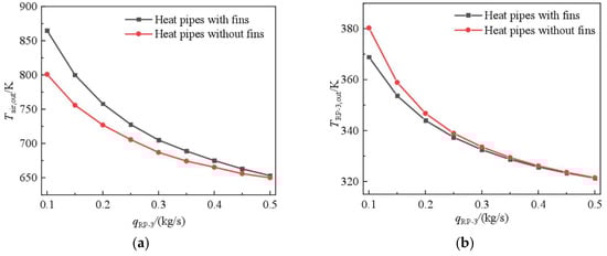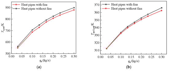 Figure 12 shows the temperature contours at the central cross-section of the evaporation section. Figure 13 shows the variation in temperature at the outlet with the qa in the evaporation and condensation sections. As shown in Figure 12, as the qa increases, its local velocity gradient also increases. Therefore, the convective heat transfer increases correspondingly. In contrast, the heat exchange capacity per qa decreases, and the temperature at the outlet shows a shrinking trend. At a small intake mass flow rate, the intake air can fully exchange heat with the heat pipe, then leading to higher heat transfer per qa. For instance, at qa = 0.1 kg/s, the temperature near the outlet of the evaporation section is 705 K. As the qa increases by 0.3 kg/s, its temperature is 890 K. Therefore, the installation of fins further reduced the temperature near the outlet of the evaporation section by about 20 K. As shown in Figure 13, as the intake mass flow rate increases, the temperature near the outlet of the evaporation section also increases, and its rate of growth slows down gradually, while the temperature of kerosene gradually decreases, and the growth rate also slows down. For the case without fins, as the intake mass flow rate varies from 0.1 kg/s to 0.3 kg/s, the temperature drop of the air reduces from 545 K to 360 K, and the kerosene temperature rise increases from 33.6 K to 61.8 K. After installing fins in the condensation section, the temperature in the evaporation section further decreased by 20 K; meanwhile, the kerosene side temperature increased by 6 K.
