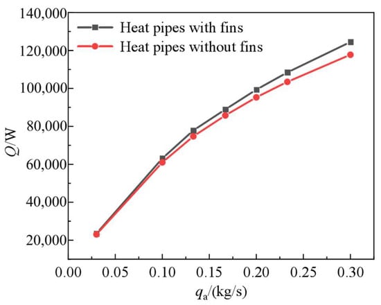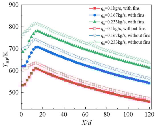 Figure 14 shows the variation in the comprehensive heat exchange capacity with the mass flow rate of air. Figure 15 shows the temperature distribution along the flow direction at different mass flow rates of air. As shown in Figure 14, an increase in the intake mass flow rate effectively enhanced the heat exchange capacity of the streamline heat pipe heat exchanger. The convective heat transfer between the heat pipe and the air increases with an increase in intake mass flow rate. Moreover, the effect of fins on enhancing the heat exchange capacity increases with an increase in the intake mass flow rate. For instance, at qa = 0.3 kg/s, the heat exchange capacity of the streamline heat pipe heat exchanger with fins can reach 12.4 kW. Although the overall heat exchange capacity increases with an increase in the intake mass flow rate, the heat exchange capacity per qa shows a decreasing trend. As shown in Figure 15, as the intake mass flow rate increases, the temperature along the heat pipe increases and then gradually decreases. As the intake mass flow rate varies from 0.1 kg/s to 0.167 kg/s, the peak temperature difference of the heat pipe increased by 106 K. As the qa increases from 0.233 kg/s to 0.3 kg/s, the peak temperature difference of the heat pipe is within 52 K. The variation in the heat pipe temperature with the intake mass flow rate is consistent with the variation in the temperature of intake air. After the installation of fins in the kerosene section, the temperature difference in both cases becomes notable. This is attributed to the fact that the larger the intake mass flow rate, the higher the temperature of the heat pipe.