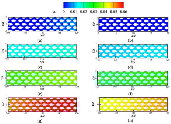 Pressure contours at the central cross-section of evaporation section: (a) qa = 0.1 kg/s, with fins. (b) qa = 0.1 kg/s, without fins. (c) qa = 0.167 kg/s, with fins. (d) qa = 0.167 kg/s, without fins. (e) qa = 0.233 kg/s, with fins. (f) qa = 0.233 kg/s, without fins. (g) qa = 0.3 kg/s, with fins. (h) qa = 0.3 kg/s, without fins.