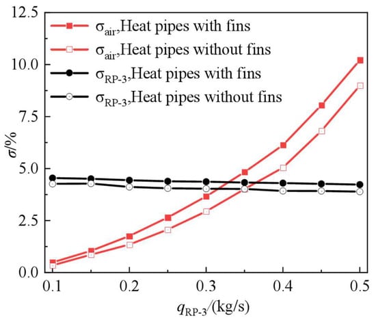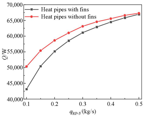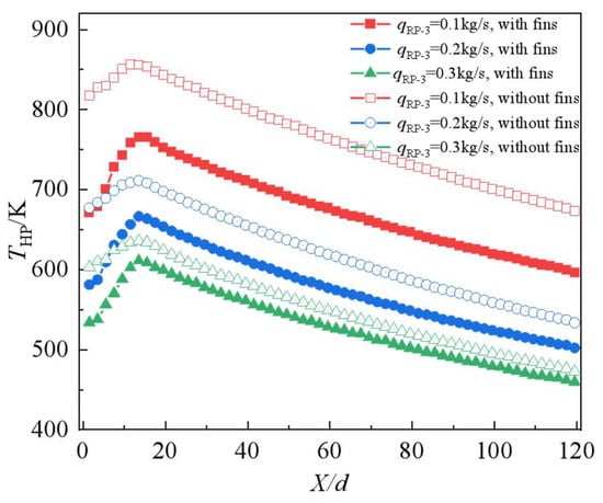 Figure 18 shows the variation in the temperature drop with the qRP-3. Figure 19 shows the variation in the comprehensive heat exchange capacity with the qRP-3. Figure 20 shows the temperature distribution along the flow direction at different mass flow rates of kerosene. As shown in Figure 18 and Figure 19, there was an increase in convective heat transfer in the evaporation section due to an increase in the temperature difference between the heat pipe and kerosene. Compared to the increase in convective heat transfer in the evaporation section, the increase in convective heat transfer was also companied in the condensation section. An increase in the qRP-3 caused an increase in the overall heat exchange capacity in the condensation section but a decrease in heat exchange per unit qRP-3. It is worth noting that once the qRP-3 exceeds a certain value, the temperature drop of the intake air in the evaporation section becomes less drastic. For the case without fins, as the qRP-3 varies from 0.4 kg/s to 0.5 kg/s, the temperature drop increases by 15 K, and the heat exchange capacity in the evaporation section only increases by 1%. As shown in Figure 20, at qRP-3 = 0.1 kg/s, the average temperature difference in both cases is 90 K. As the qRP-3 increases, the average temperature difference in the two cases gradually decreases. As qRP-3 is greater than 0.3 kg/s, it is less than 15 K.